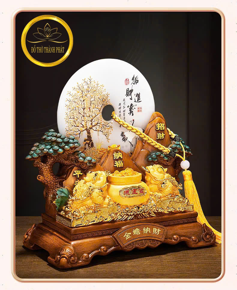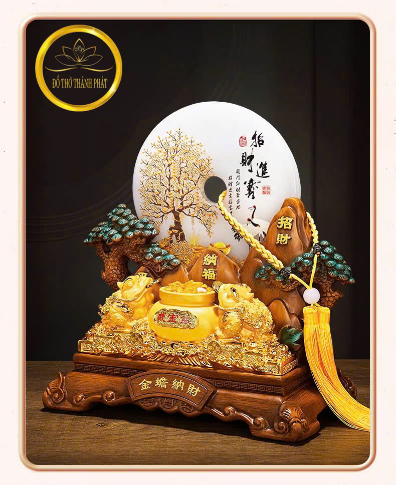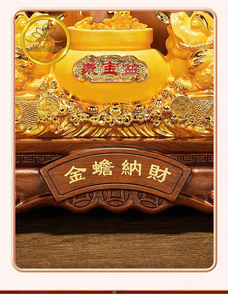 Thiềm Thừ (cóc ba chân) ngậm tiền vàng – biểu tượng của tài lộc, giúp gia chủ giữ của, làm ăn phát đạt.